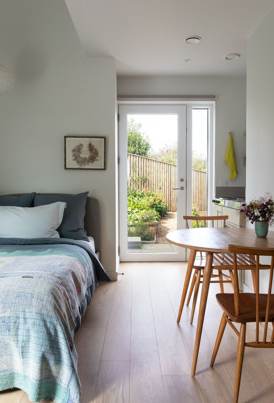 Across the hall and into Wren Studio, soon kicking off your shoes... and with them the outside world... you feel deeply held in the sumptuous natural materials, in this retreat space designed with you in mind. The ease and comfort of the room welcomes you... sitting back on the sofa to take it all in.